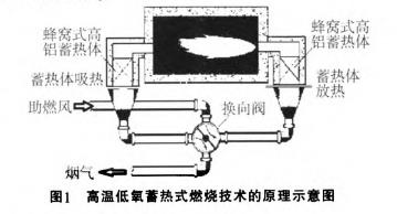 通過蓄熱式燃燒原理可知.常溫空氣是用高壓風(fēng)機(jī)由四通換向閥切換進(jìn)入預(yù)熱器后在短時間內(nèi)被加熱到700℃左右,熱空氣進(jìn)入爐膛后,抽吸周圍低氧爐氣,從而形成含氧量低于21%(一般在15%)的低氧高溫空氣。然后再與空氣噴嘴附近噴入的燃料混合燃燒。