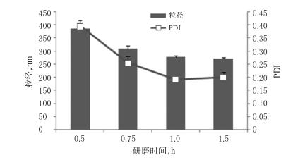2.1.3研磨時(shí)間的篩選稱取BRE原料藥7.5g,置于含有吐溫80(1.125g)的水溶液(22.5mL)中,攪拌混懸,加入氧化鋯珠(粒徑為0.6mm)450g,分別研磨0.5、0.75、1.0、1.5h,制備3批BRE納米晶混懸液。以BRE納米晶混懸液的粒徑、PDI為指標(biāo),篩選研磨時(shí)間。結(jié)果,隨著研磨時(shí)間的延長(zhǎng),BRE納米晶混懸液的粒徑、PDI逐漸減?。谎心?.5、0.75、1.0h時(shí),BRE納米晶混懸液的粒徑、PDI減小的幅度較大;研磨1.5h時(shí),BRE納米晶混懸液粒徑雖然較研磨1.0h時(shí)的粒徑減小,但減小幅度不大。綜合考慮能耗和時(shí)間,確定研磨時(shí)間為1h。研磨時(shí)間的篩選結(jié)果見(jiàn)圖3。